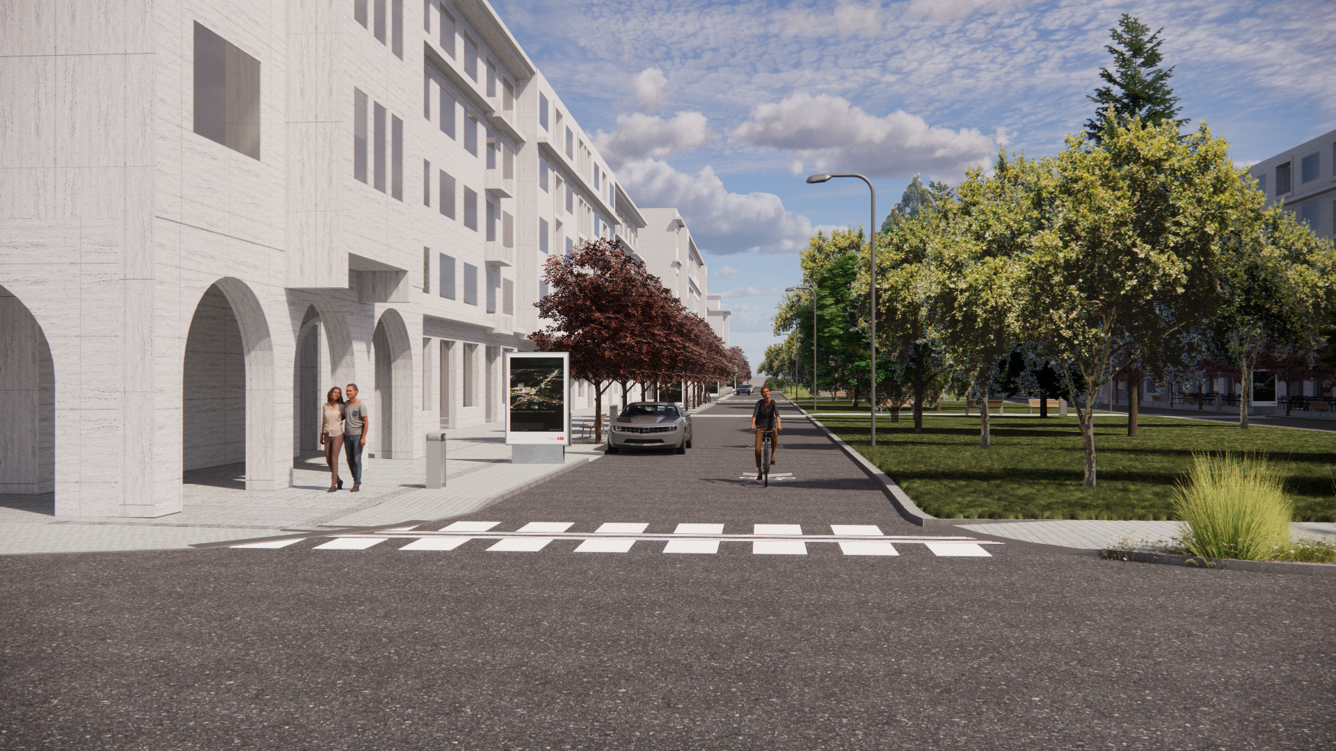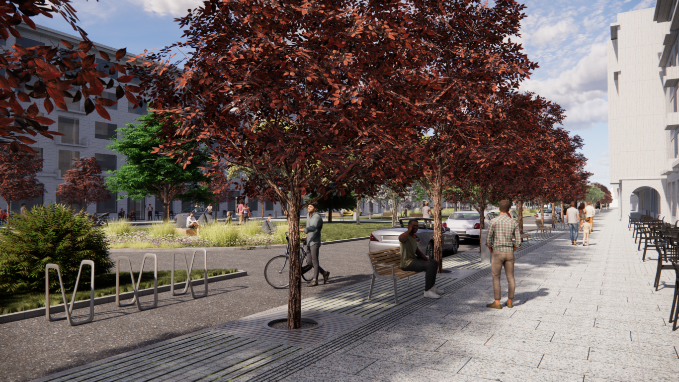 Priestor pre cyklistov zostane na ceste nezmenený – cyklotrasa bude vyznačená piktogramami, zatiaľ čo chodci získajú na chodníku samostatný pruh so zeleňou a mobiliárom. Počíta sa aj s vyhradenými miestami pre prevádzky a letné terasy, ktoré budú vizuálne oddelené kovovou pásovinou.